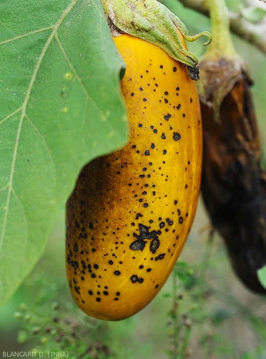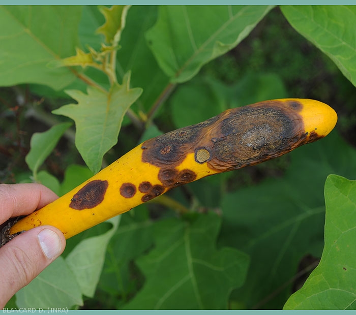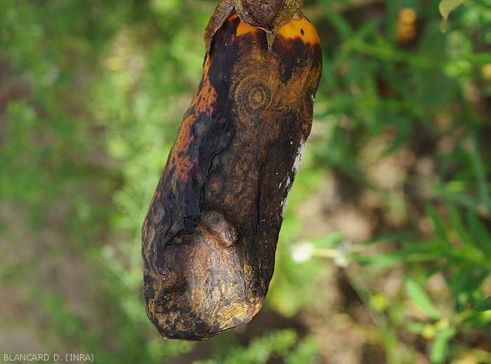 Taches circulaires humides s'étendant, brunissant et noircissant progressivement sur les fruits au fur et à mesure de leur maturation (figures 6 et 7). Les taches sont légèrement concaves et peuvent coalescer, et provoquer une pourriture de secteurs importants des fruits (figure 7), voire les dégrader entièrement. Altération des graines qui prennent une teinte rouille.