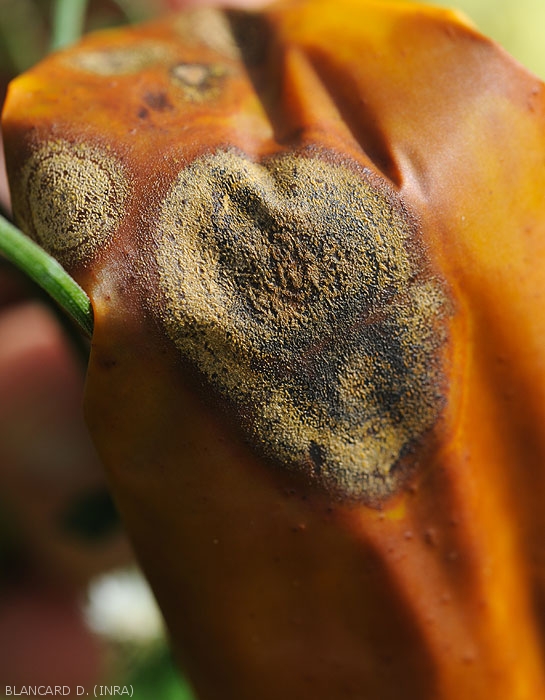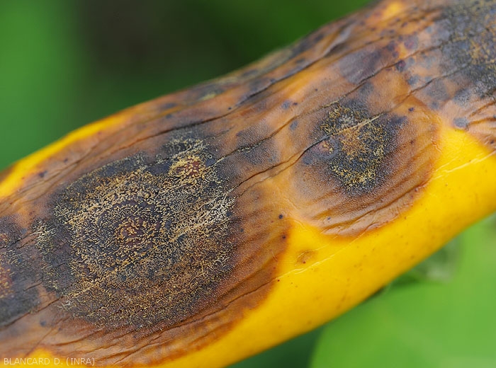 Signes: présence sur les lésions de conceptacles plats et superficiels, des microsclerotes et des acervules, parfois répartis en cercles concentriques (figure 8). Les acervules produisant de très nombreuses spores en masses mucilagineuses de couleyr rosâtre à saumon. Chez de nombreuses espèces de Colletotrichum des soies noires (ou setae) sont observées au sein de ces structures.