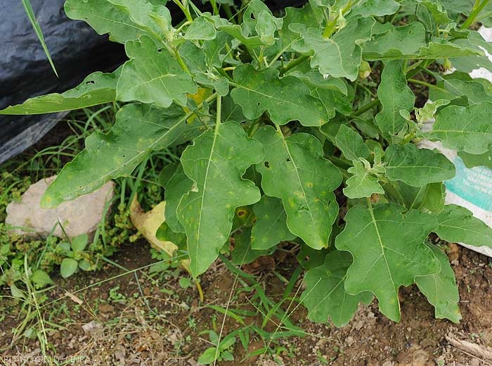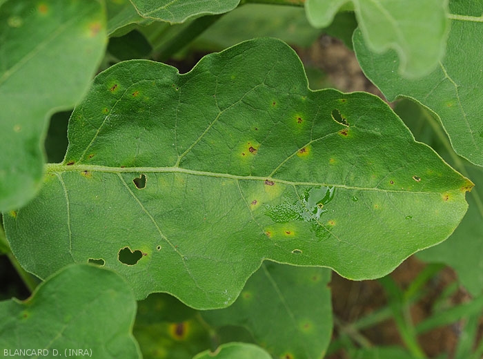 Petites lésions chlorotiques irrégulières devenant rapidement nécrotiques sur feuilles. Un halo jaune plutôt marqué les ceinture (figures 1 à 5). L'anthracnose ne semble pas avoir une forte incidence sur le feuilllage de l'aubergine.