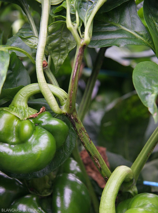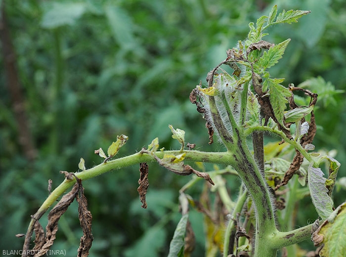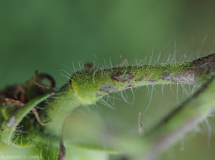- Lésions nécrotiques allongées (streak) sur pétioles et tiges (figures 8 et 9-tomate ; 19-poivron).