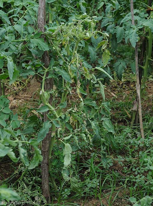 - Croissance des plantes fortement affectée, une courbure apicale peut être observée. Celles-ci peuvent flétrir et se nécroser entièrement (figure 10).