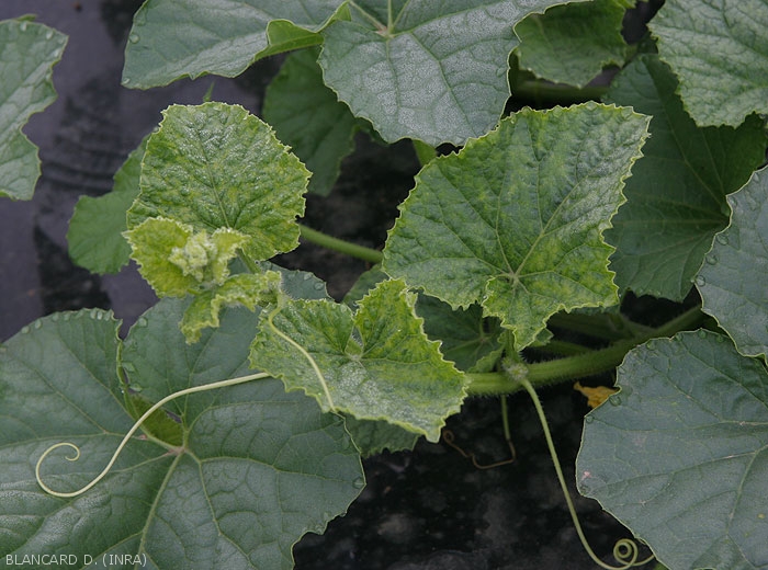 - Taches chlorotiques, mosaïque, jaunissement des feuilles (figures 1-melon ; 3-courgette ; 4-courgette, 6-courge)