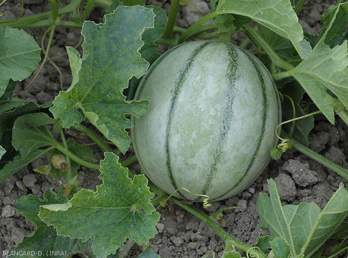 - Mosaïque plus ou moins marquée, piqûres sur fruits (figures 2-melon ; et 5-courgette).