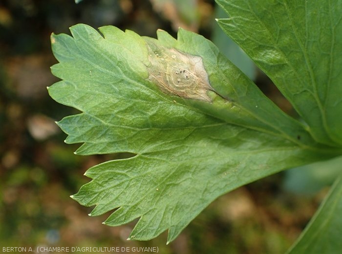 Lésions plutôt circulaire humides à graisseuses s'étentant progressivement.