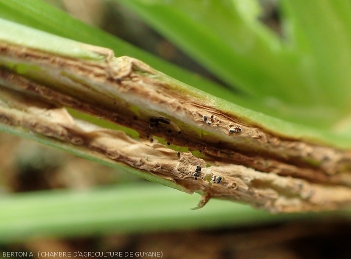 : présence de coussinets sporifères grisâtres à noirs : des sporodochies (figure 3). Ces structures sont constituées de nombreuses phialides qui forment à leur extrémité des conidies cylindriques, hyalines à légèrement olivâtres.