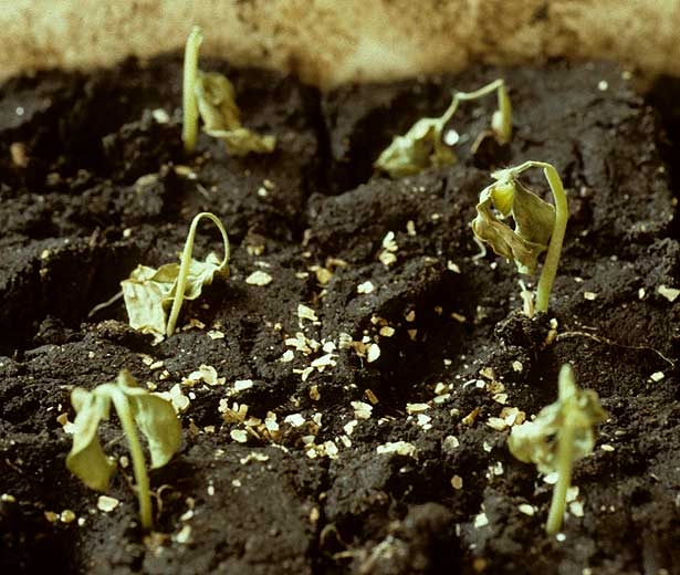 - Flétrissement et dessèchement des cotylédons et des jeunes feuilles, effondrement des plantules (figures 3, 5 et 6).