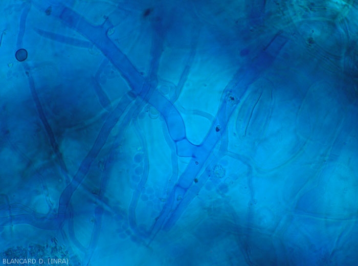 - Signes : diverses structures en fonction du champignon ou de l'oomycète responsable (mycélium - figures 7 et 8-, sclerotes, oospores - figure 9 -, sporanges, etc.).
