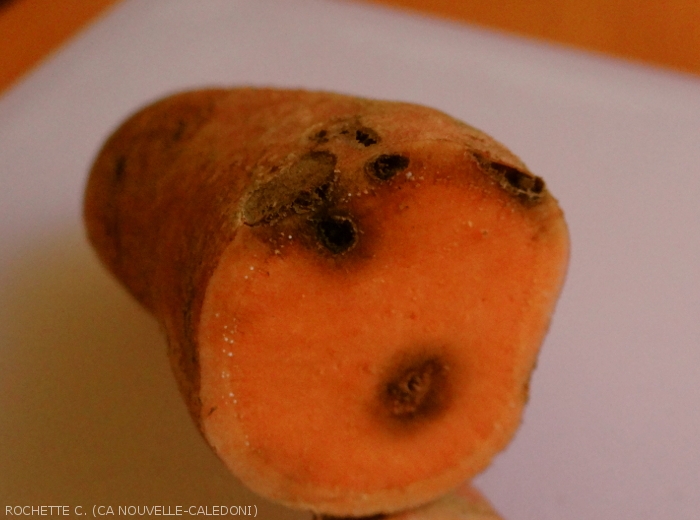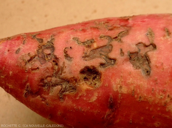 - Présence de galeries dans les tubercules des patates douces occasionnées par les larves ce qui déprécient fortement la qualité commerciale de la production. Les tubercules abimés sont ainsi beaucoup plus sensibles aux champignons et bactéries envahisseurs secondaires occasionnant des pourritures avant et après récoltes. Jusqu’à 97 % de la production peut-être perdue.