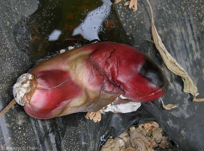 Pourriture humide, molle et sombre se développant sur les fruits, au niveau de la cicatrice stylaire ou au contact du sol. Elle s'étend rapidement et se généralise progressivement ; les fruits finissent par se ratatiner et/ou s'effondrer plus ou moins totalement (figure 7).