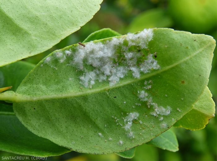 - Feuilles : sur la face inférieure les larves sécrètent du miellat et des filaments cireux.
