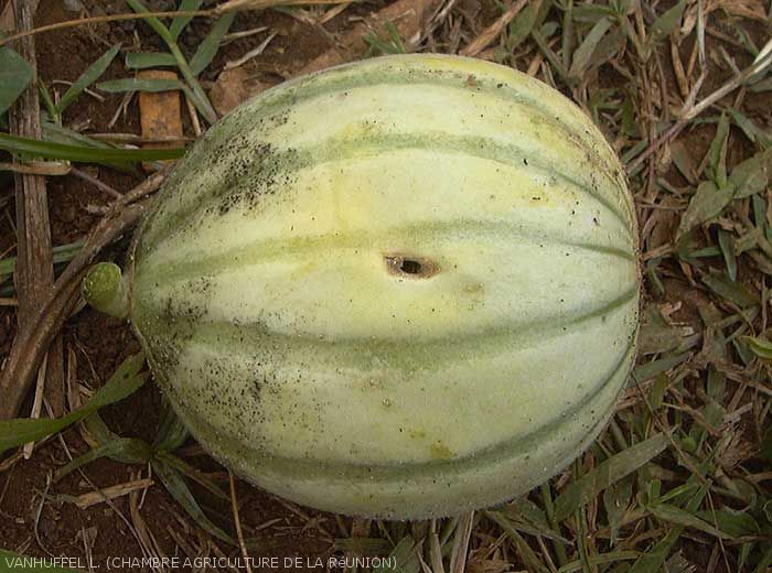 - Les mouches des cucurbitacées piquent les fruits à l'aide de leur ovipositeur pour y déposer leurs oeufs (plusieurs dizaines) à faible profondeur. Dès leur éclosion, les asticots se nourrissent de la pulpe pendant plusieurs jours avant de quitter le fruit pour s'enfouir dans le sol et se transformer en pupe. De cette pupe sortira une mouche adulte. Le cycle complet de l'oeuf à l'adulte dure de 20 à 30 jours selon l'espèce et les conditions climatiques. Un élément de biologie important réside dans le fait que les populations de mouches adultes vivent majoritairement en dehors de la parcelle cultivée, en l'occurence dans la végétation environnante ou sur des plantes pièges installées à cet effet (comme le maïs).