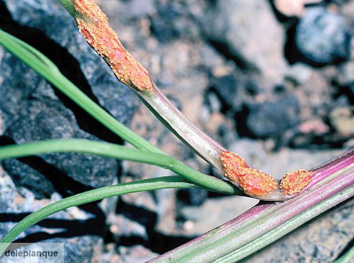 Présence de petites pustules (ø 1 mm) jaune-orangé sur les deux faces des feuilles et sur les hampes florales.
