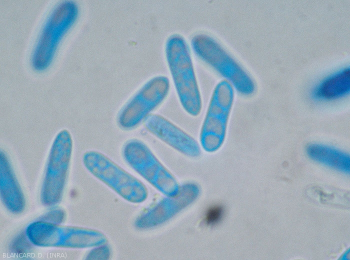 * Pour simplifier, en fonction de l'espèce, les conidies des Colletotrichum peuvent être soit ovales à oblongues et droites, soit arquées, falciformes, pointues aux extrémités.