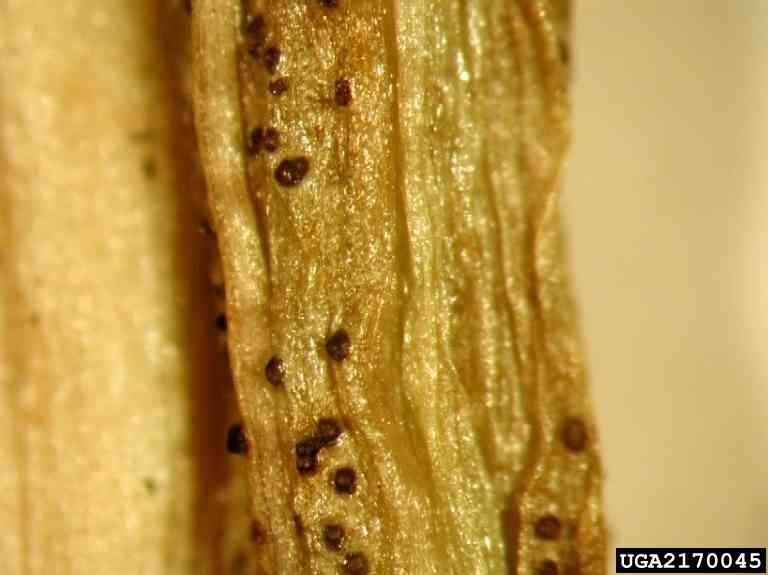 La maladie se manifeste tout d’abord par l’apparition sur le feuillage de petites taches brun clair, souvent délimitées par les fines nervures des feuilles mais parfois aux contours irréguliers de taille allant de 1 à 4mm. Elles se colorent progressivement en brun-rougeâtre et comportent en leur centre, sur la face supérieure, des petits points noirs appelés pycnides. Ces taches vont se multiplier et se propager sur l’ensemble du feuillage.