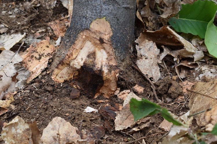 Lorsque l'agent pathogène a provoqué une altération importante des racines, cette altération se prolonge dans la base du tronc (le collet, Figures 2 et 3). Des écoulements noirs s'épanchent alors des craquelures de l'écorce qui recouvre les parties infectées du collet. Lorsque l'écorce est décapée, les tissus corticaux et le bois à nu sont colorés en brun, alors que sous l'écorce dans la zone non infectée ils sont de couleur blanc nacré (Figures 4 et 5). Ces tissus nécrosés sont les tissus envahis par l'agent pathogène.