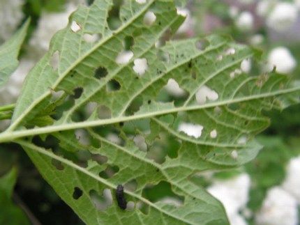Les larves et les adultes se nourrissent du feuillage. Ce sont les larves qui vont causer le plus de dégâts en s’attaquant au feuillage et en ne laissant que les nervures. En cas d’attaques répétitives plusieurs années de suite, l’arbuste perd progressivement de sa vigueur jusqu’au dépérissement total.