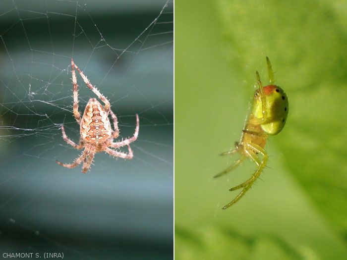 - Salticidae, ou araignées sauteuses. Famille assez facile à reconnaitre, ces araignées d'assez petite taille, sont des errantes dans la frondaison des vignes qui chassent à la vue et capturent leur proies en sautant dessus, elles ne construisent habituellement pas de toiles (photos 7 et 8). Ces araignées chassent au sol ou dans la végétation.
