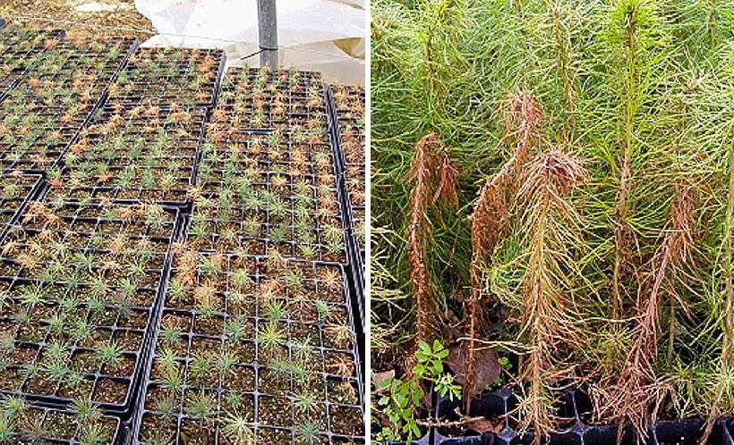 Le champignon cause des fontes de semis dans les pépinières et jeunes plantations : pourriture du collet, flétrissement des plants, rougissement et brunissement des tiges et aiguilles, extrémité apicale en forme de crosse.