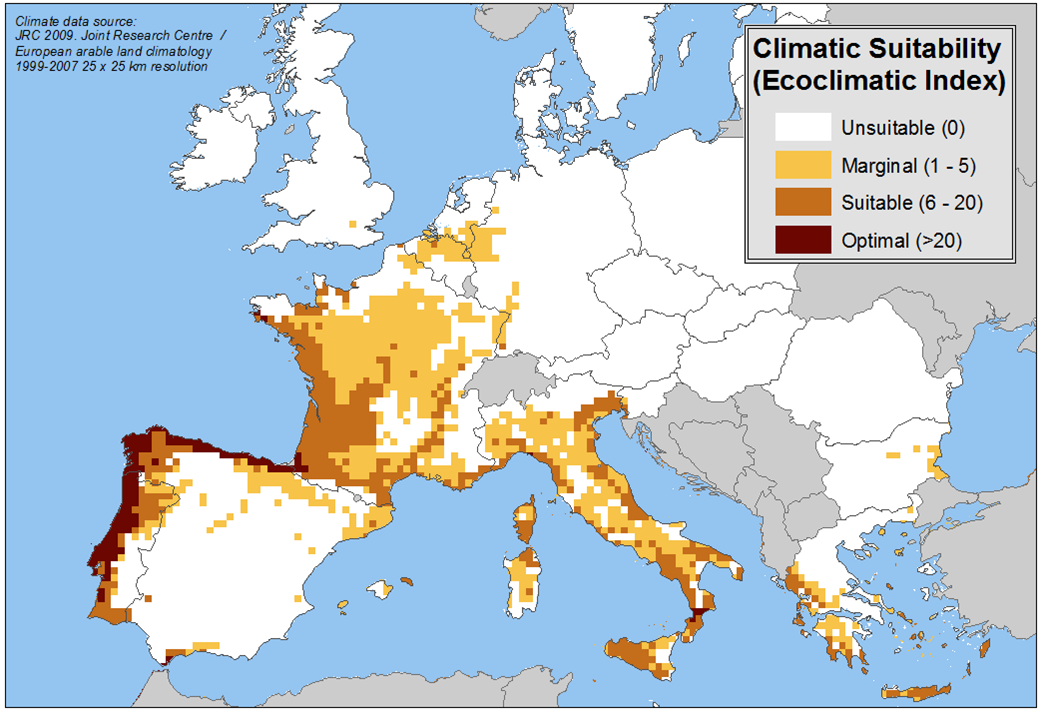 D’après les conditions climatiques et environnementales (présence d’hôtes sensibles), une grande partie de la région méditerranéenne présente un risque élevé de propagation de la maladie, ainsi que certaines régions de la façade atlantique comme le Portugal et le sud-ouest de le France.