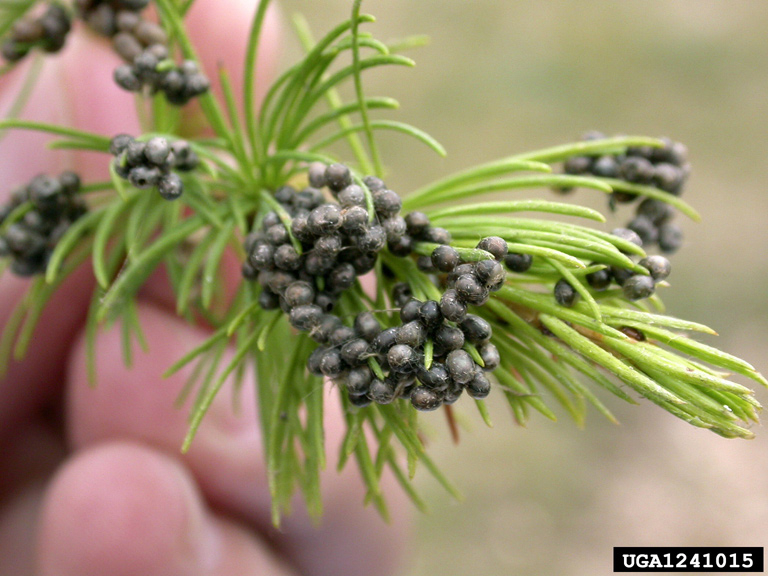 Localisation sur l'hôte : Aiguilles (ponte possible sur rameaux voire écorce des troncs)