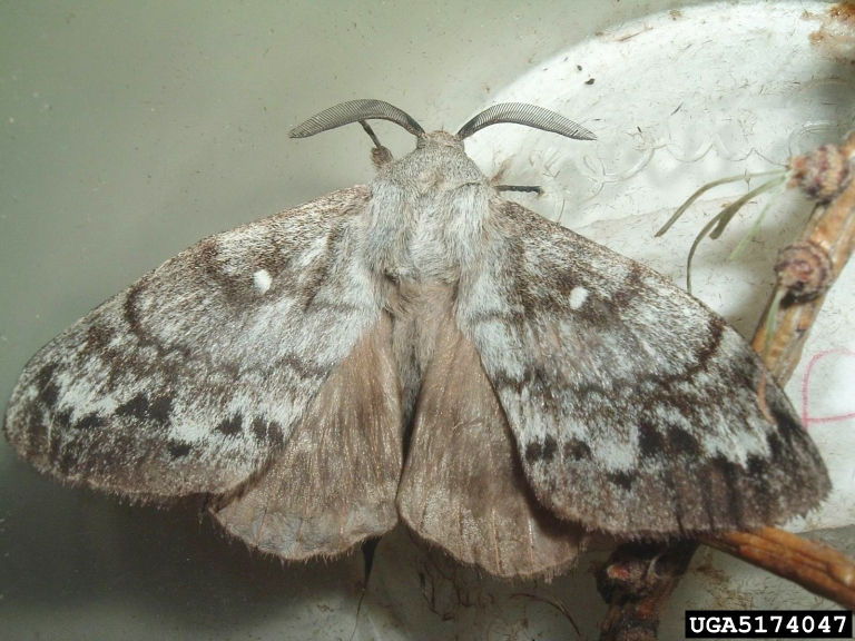 Les adultes volent de mai à juin. Il s’agit de grands papillons (envergure 4 à 6 cm chez le mâle, jusqu’à 10 cm chez la femelle). Les ailes sont marron-violet avec un point blanc caractéristique au centre des ailes antérieures (voir photo). La femelle pond ses œufs par petits groupes sur les aiguilles, les branches (plutôt dans la partie basse du houppier) et parfois même sur le tronc. Elle pond en général 200 – 250 œufs. Les œufs ovoïdes sont brun-jaune à verdâtres, mesurent environ 2mm de long.