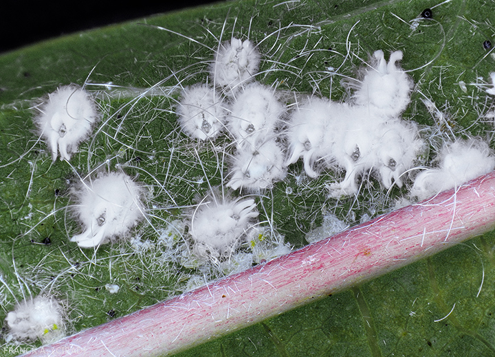 Après l'éclosion, les jeunes larves se déplacent vers les nervures des feuilles pour se nourrir. En grandissant, elles développent des amas de cire. Au premier stade, les larves sont mobiles, puis elles se fixent à la feuille. La durée de développement larvaire est de 20 à 35 jours selon la température.