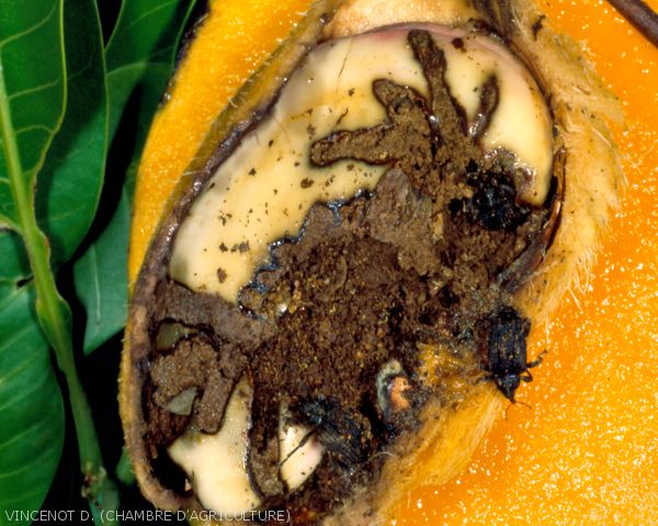 Les fruits endommagés présentent des marques évidentes de résine dure sur la peau du fruit, de couleur ambrée et qui protège les œufs.