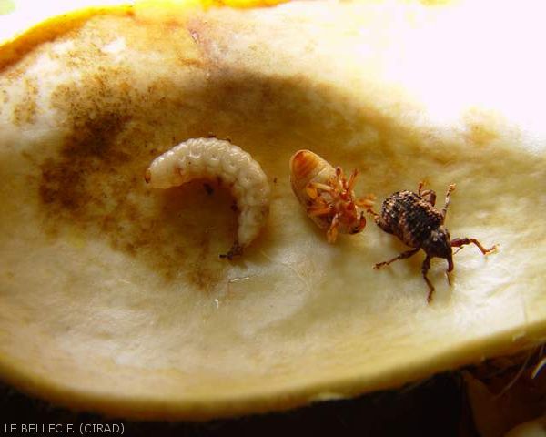 La larve creuse, sans laisser de trace, dans la pupe jusqu’au noyau. Elle va effectuer ses quatre stades larvaires dans l’endocarpe en se nourrissant des cotylédons.