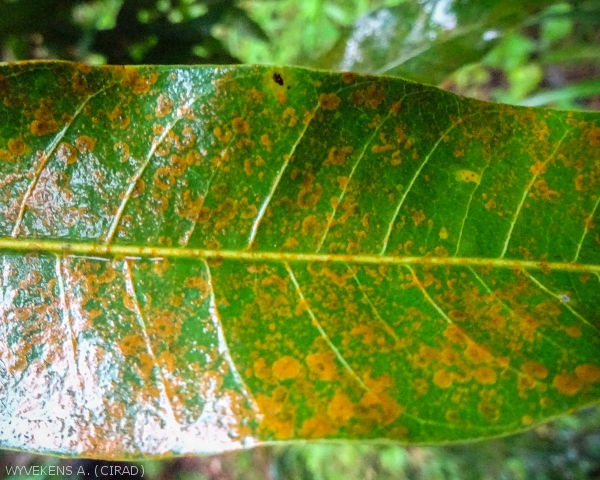 - Face supérieure de la feuille : des taches arrondies de couleur orange cuivrée allant jusqu’à 2 cm de diamètre. Ces taches ont un bord irrégulier et filamenteux.