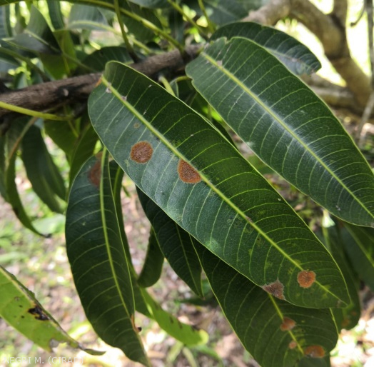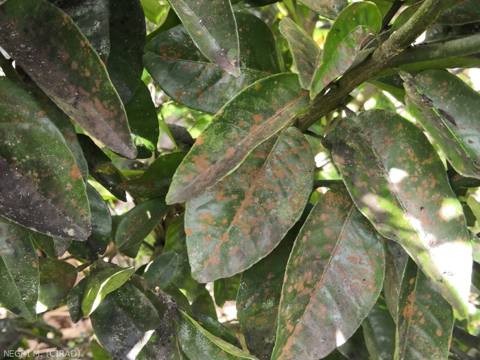 La rouille rouge est une algue de la famille des Trentepohliaceae se développant sur de nombreuses espèces dans les zones tropicales et subtropicales, où le climat est chaud et humide. Elle cause des dégâts très mineurs et ne nécessite pas de traitement si le verger est correctement entretenu.