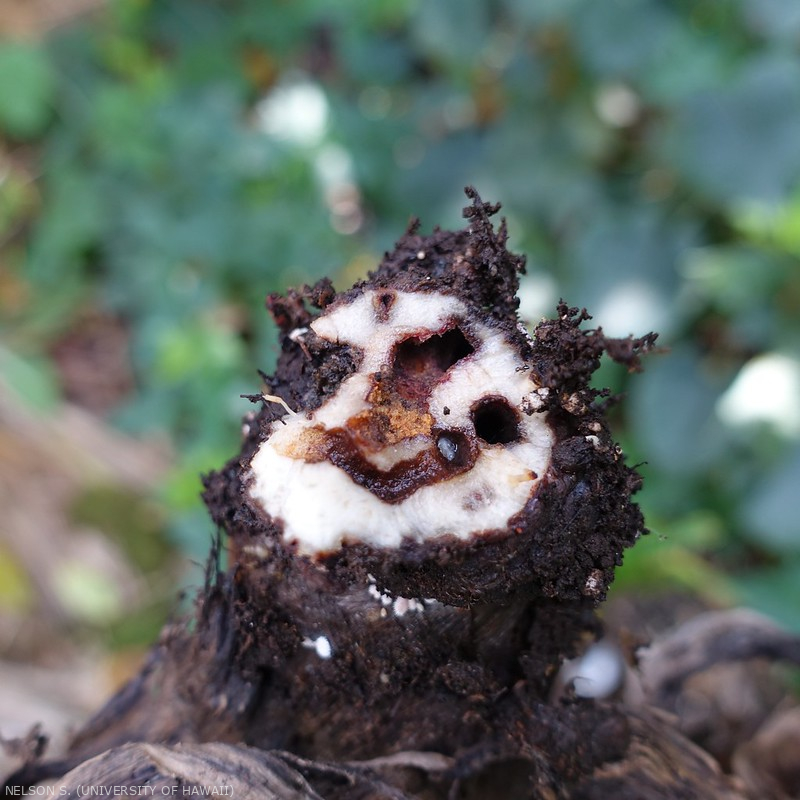 - À la récolte, couper les pseudo-troncs au plus haut et accélérer la destruction des résidus végétaux en les coupant en petits morceaux afin de supprimer les refuges et les sources de nourriture des charançons.