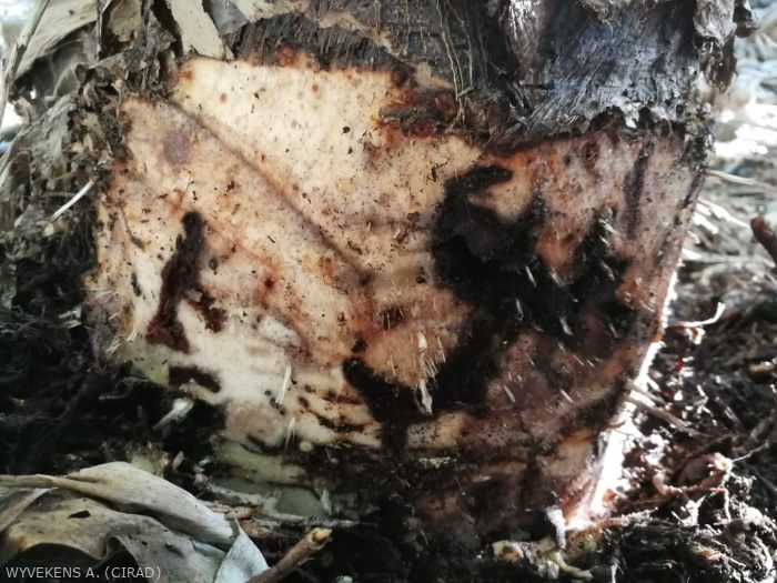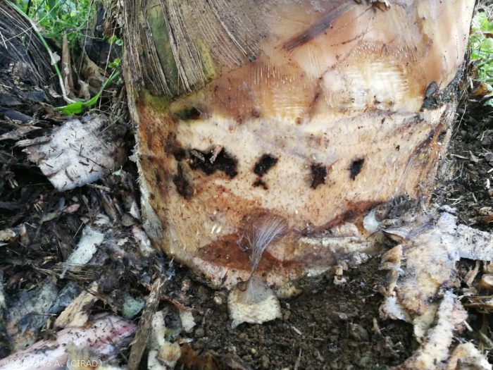 - Système racinaire : dégâts qui limitent l’absorption des éléments nutritifs, réduisent la vigueur des plants, retardent leur floraison, accroissent leur sensibilité aux autres ravageurs et maladies d'origine tellurique et augmentent les risques de casse des plants (porteurs du régime et pendant les coups de vent).