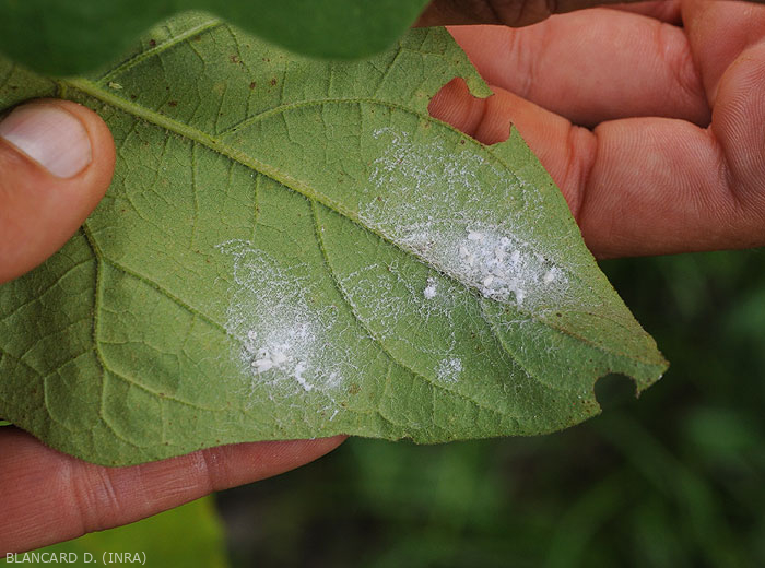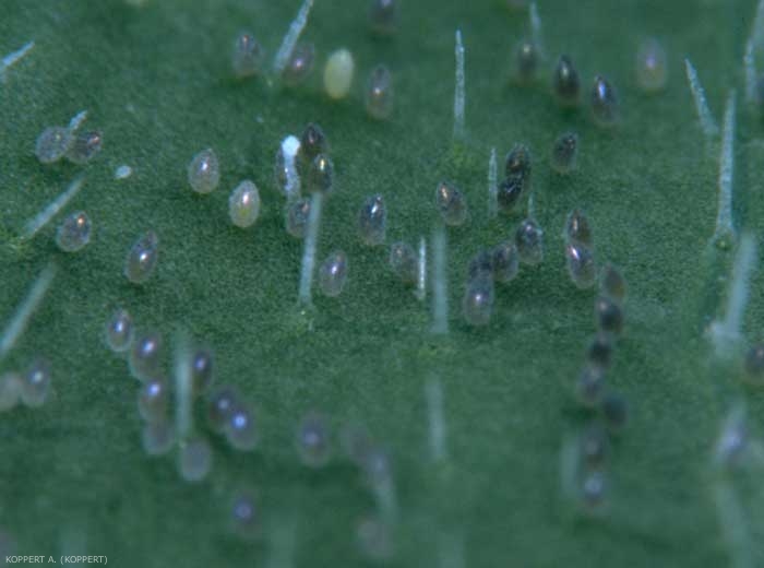 Signes: Présence de larves et d'adultes sur les organes affectés (figures ). De la fumagine (sooty mold) (figure ) est souvent associée à la présence d'aleurodes. Rappelons que cette dernière entraine une réduction de la photosynthèse et de la respiration foliaire et rend les productions non commercialisables.