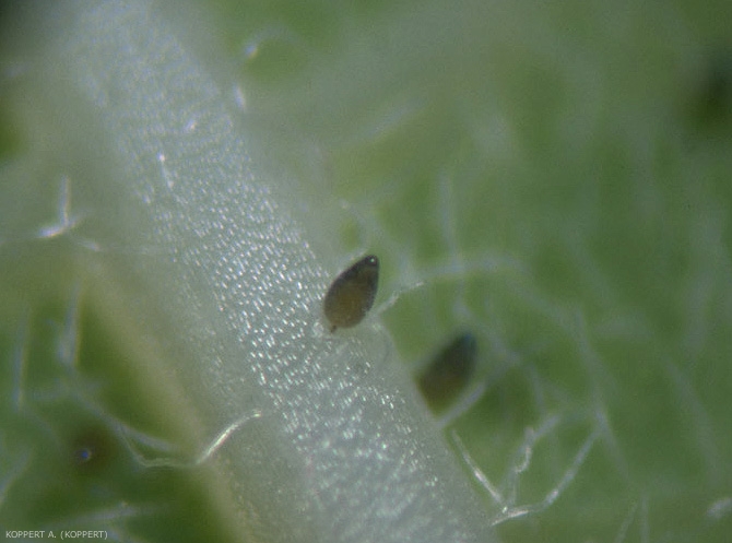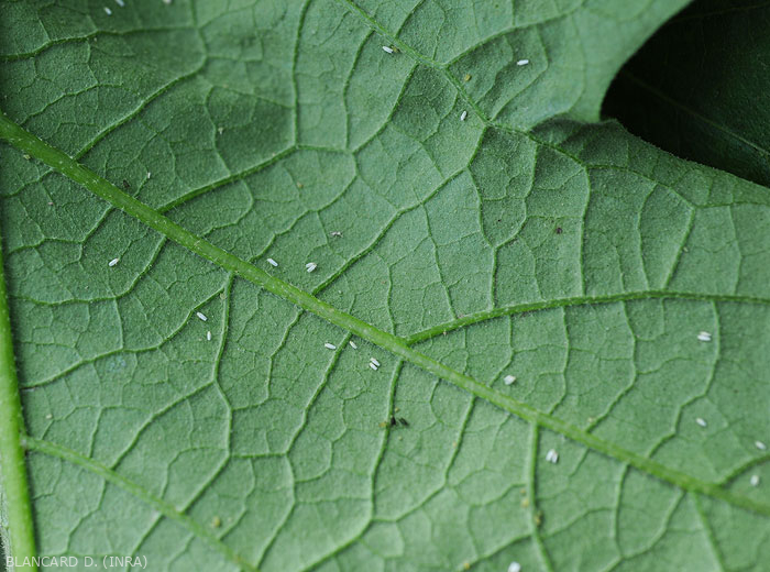 Dispersion : Les adultes volent peu mais sont facilement emportés par le vent, et se dispersent rapidement dans les cultures. La diffusion de plants infestés contribue à la dispersion de ces insectes.