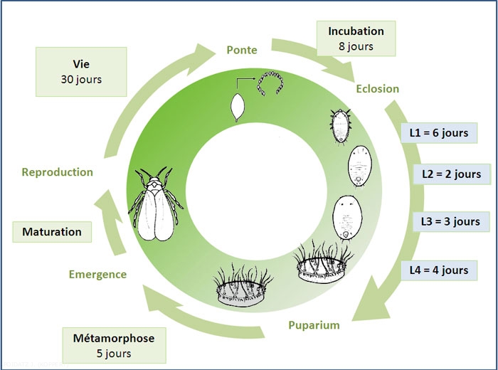 Cycle de développement : comprend 3 phases de développement se déroulant à la face inférieure des feuilles des plantes attaquées : œuf, 4 stades larvaires et adulte. Seul le premier stade larvaire est mobile et le dernier en fin de développement est appelé nymphe ou puparium. La durée du cycle complet (figure ) varie en fonction de la température, de la plante-hôte et des différentes espèces, et est d'environ 3 semaines en conditions tropicales. Dans les conditions tropicales, les cycles sont continus et tous les stades sont présents à un même moment.