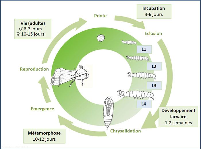 - Cycle de développement : comportant 4 stades de développement : oeuf, larve, chrysalide et adulte. Sa durée varie en fonction de la température notamment ; par exemple, il serait approximativement de 24 jours à 27°C. Il pourrait y avoir jusqu'à 10 à 12 générations par an.