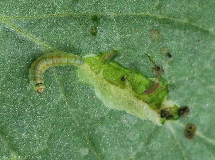- Quatre stades larvaires se succèdent, avec des larves mesurant quelques millimètres de long. D'abord de couleur crème, puis verdâtres à rosées, elles creusent des galeries sur les organes aériens de la tomate.