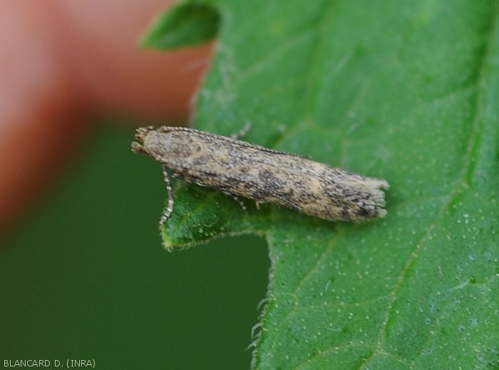 - Adultes, des papillons, mesurant de 5 à 7mm de long et environ 10mm d'envergure. Ils ont une teinte gris argenté à marron avec des tâches noires sur les ailes antérieures. Les mâles sont un peu plus foncés que les femelles. Leurs antennes sont filiformes. La durée de vie approximative des adultes est de 6-7 jours pour les mâles et 10-15 jours pour les femelles. Chaque femelle peut pondre de 40 à 250 oeufs souvent localisés à la face inférieure des feuilles ou au niveau des jeunes tiges tendres et des sépales des jeunes fruits.
