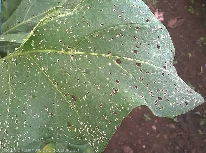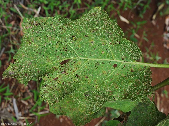 - Feuilles présentant de petites perforations du limbe régulières (quelques millimètres) et plutôt arrondies ; elles sont liées au parasitisme des insectes adultes qui broutent et dévorent régulièrement les faces supérieure et inférieure du limbe (figure ).