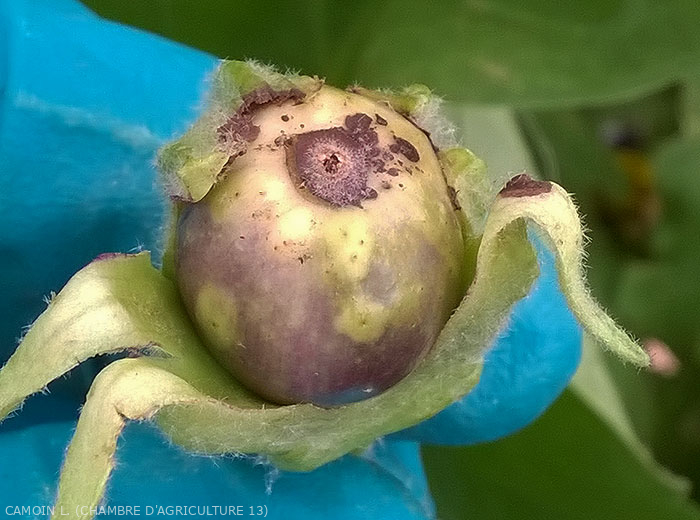- Petites lésions sur jeunes fruits au moment de la nouaison qui en grossissant se lignifient et se décolorent en périphérie. Leur incidence devient plus importante au fur et à mesure du développement des fruits ce qui peut entraîner leur déclassement.