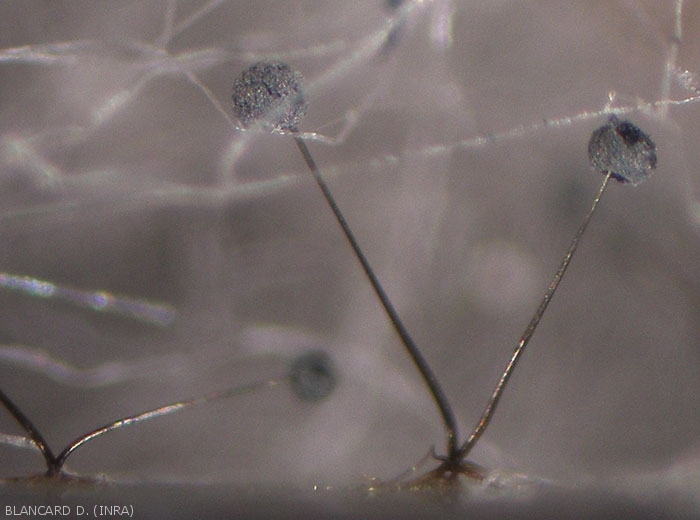- Sporulation : elle est rapide sur les organes pourris avec production de sporangiophores hébergeant d'innombrables spores noires dans des vésicules sporifères (figures 1 à 4).