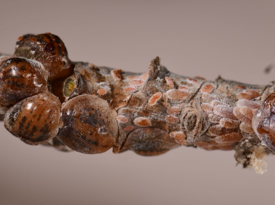 Consommation par les larves et les adultes femelles sur les rameaux fins, de préférence ceux de l’année.