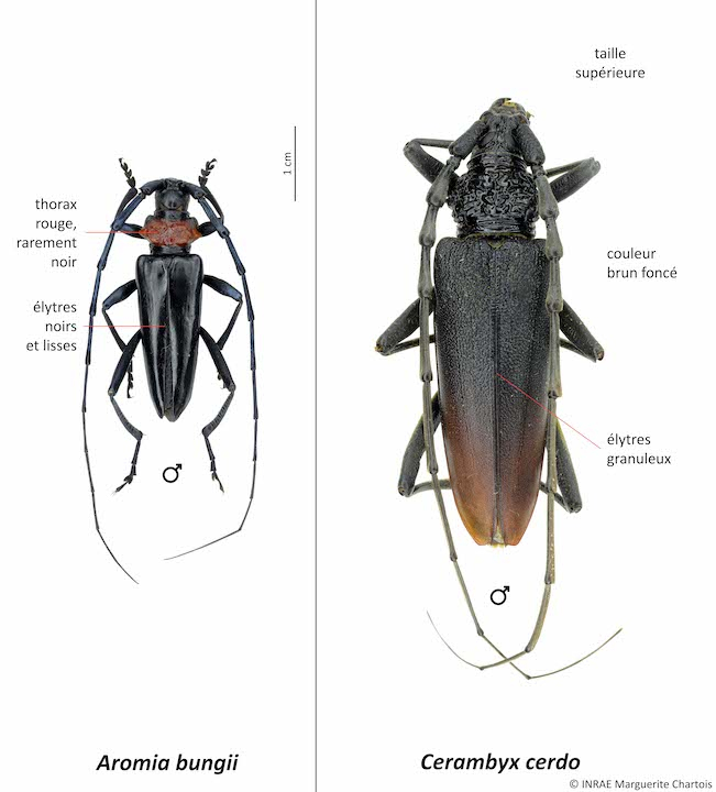 Cerambyx cerdo est beaucoup plus grand qu’Aromia bungii (24 à 62 mm contre 20 à 40 mm). Son corps est entièrement brun-noir avec le bout des élytres parfois plus clair et brun rougeâtre. Les élytres de C. cerdo sont granuleux tandis que ceux d'A. bungii sont lisses.