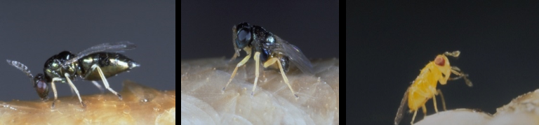 Baryscapus servadeii (à gauche), Ooencyrtus pityocampae (au centre) et un trichogramme (à droite) sur pontes de processionnaires du pin (© G. Demolin-INRAE).