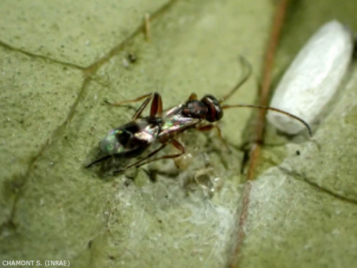 Les parasitoïdes sont de petites guêpes qui lors de leurs pontes parasitentes les cochenilles mais surtout les cicadelles. On les retrouvent sur les feuilles de mai à juillet.