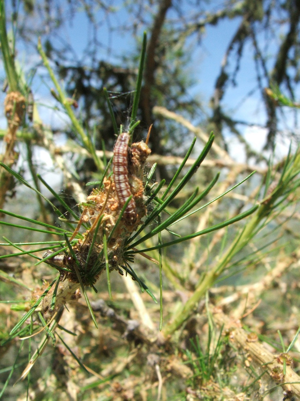 L'envol des adultes se déroule en mai-juin, les mâles étant souvent plus nombreux que les femelles. Les oeufs sont pondus sur les aiguilles des pousses courtes. Les larves filent leurs toiles à la base des pousses courtes et demeurent dans leur toile en s'alimentant des aiguilles en même temps. La prise de nourriture se déroule principalement en juillet. Les larves développées tombent à terre et s'enfoncent 5 à 20 cm sous la surface du sol, ce sont des “eonymphes” sans cocon. En septembre elles deviennent des “pronymphes” et entrent en hibernation. La nymphose se déroule au printemps. Les larves peuvent cependant demeurer dans le sol sous la forme d'eonymphes jusqu'à quatre hivers avant de se métamorphoser.