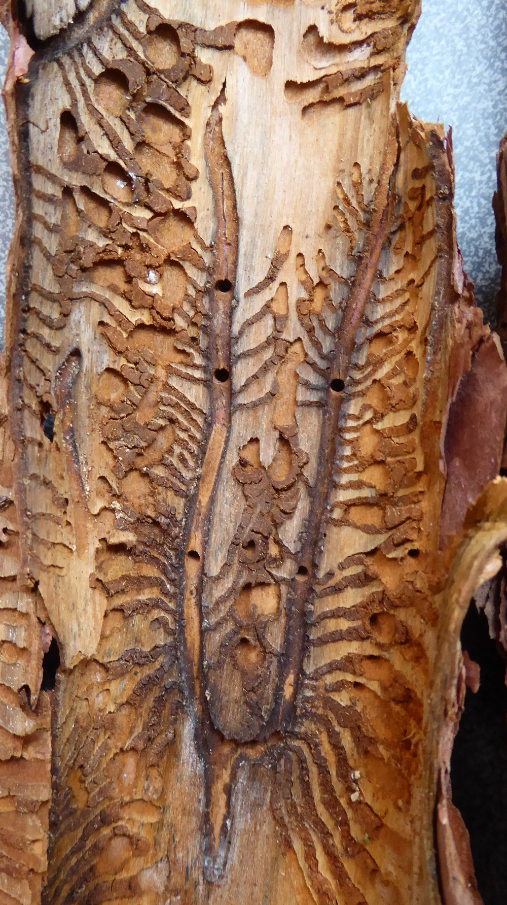 - Galeries sous écorce de type "étoilé", à vestibule central d'où partent longitudinalement de longs bras fins, sinueux, pouvant atteindre 10 cm - couloirs larvaires très courts, perpendiculaires, marquant faiblement le bois par rapport aux galeries maternelles qui impressionnent profondément l'aubier.