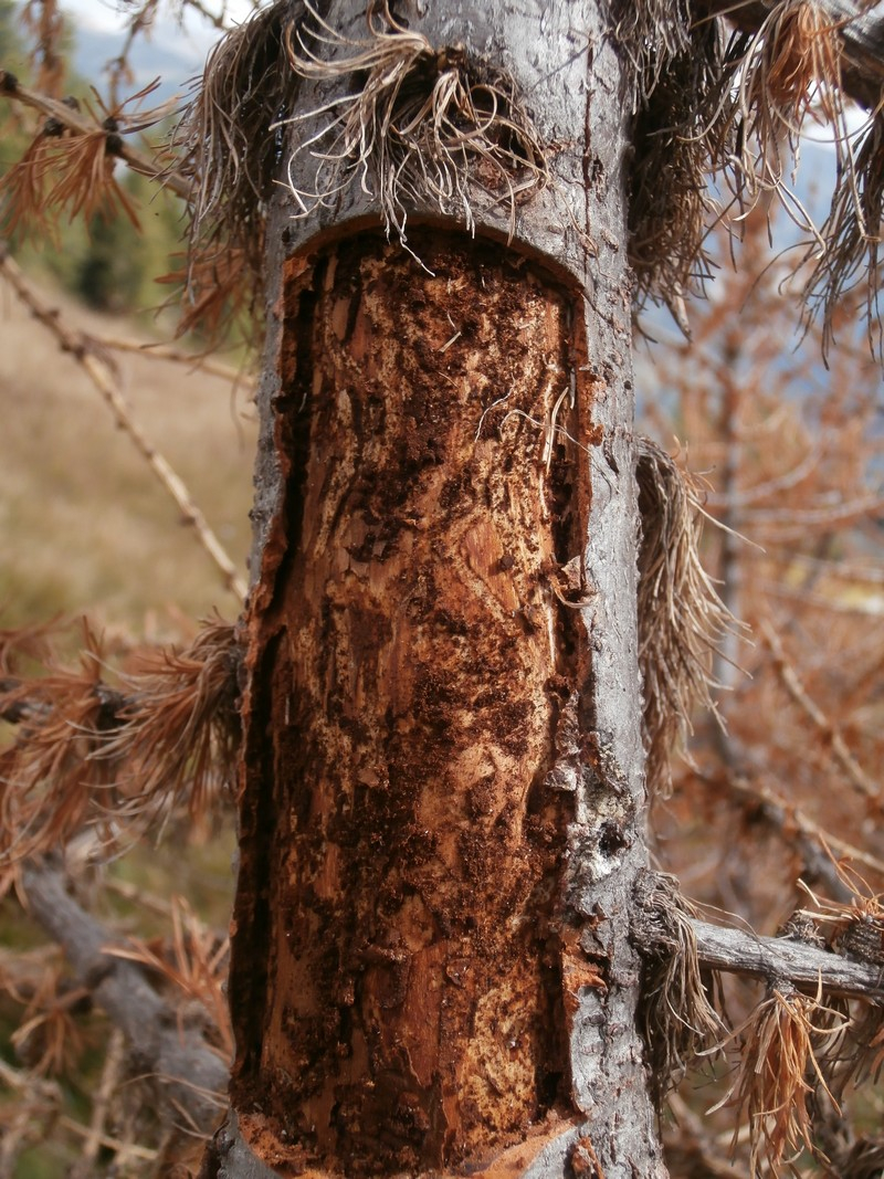 - L'attaque d'Ips cembrae s'avère plus rapide dans la partie supérieure du tronc que dans le bas, mais à terme, il colonise tout l'arbre.
