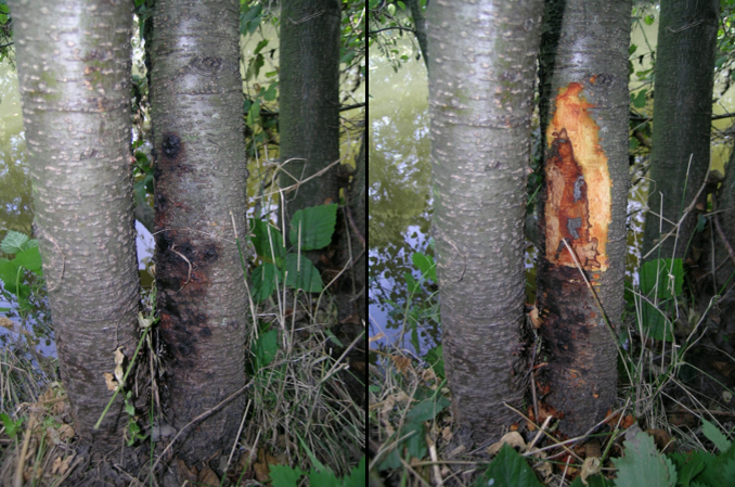 Des blessures mécaniques ou des attaques d'insectes peuvent provoquer des taches suintantes et des coulures. Il est nécessaire de décaper l'écorce sous les taches pour vérifier la présence de lésions sous-corticales en forme de flamme en connexion avec le sol.