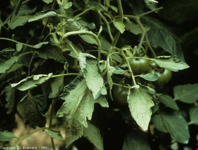 Les quelques symptômes observables sur les photos illustrent bien cette affection qui touche surtout les cultures sous abri des zones de production plutôt situées sous des latitudes nordiques. Notons que ces symptômes se manifestent à n'importe quel stade de développement de la tomate et se caractérisent par :